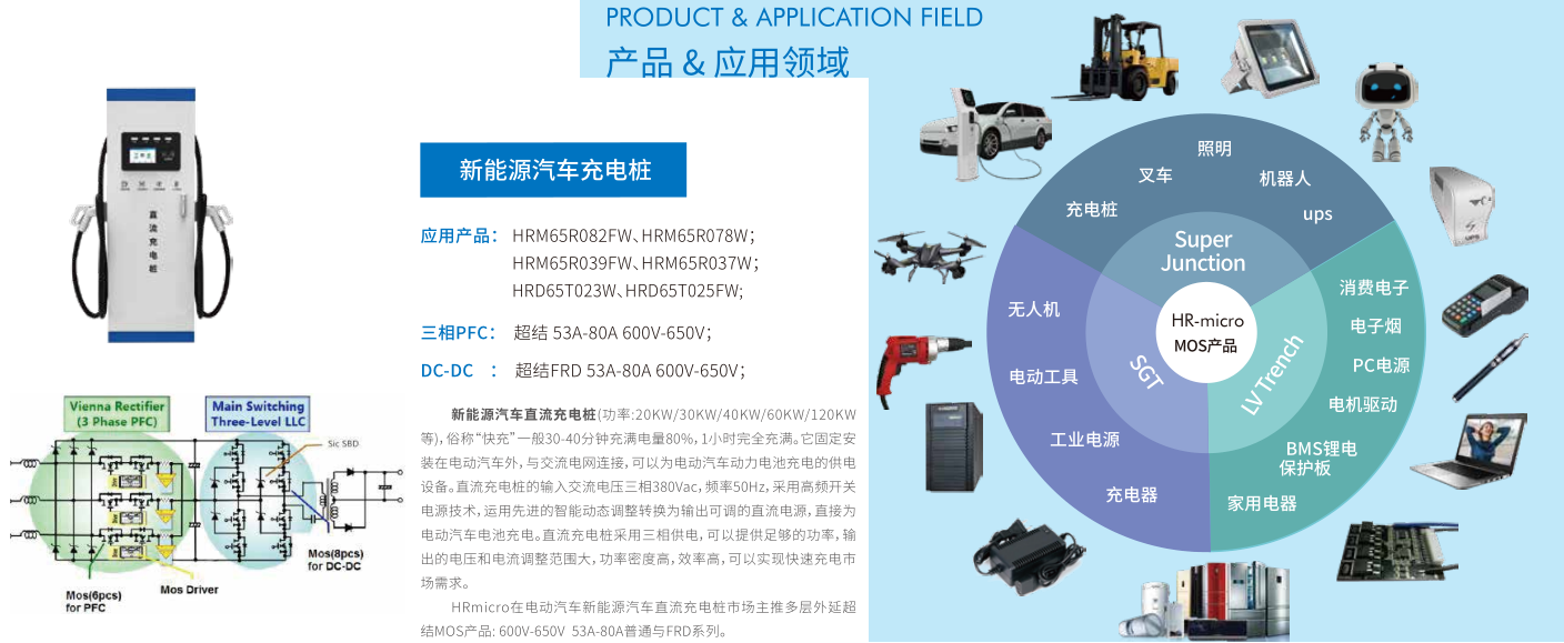 HRmicro推出的第二代、第三代超结MOSFET系列产品,打破了传统平面VDMOS的硅极限,使得导通电阻与击穿电压的关系得到了极大的改进,由传统的2.5次方变为线性关系,极大的优化了器件的品质因数FOM(Rdson*Qg),比传统VDMOS具有更快的开关速度,更低的开关损耗,更优的转换效率;第二代及第三代超结MOSFET分别针对性的优化了EMI特性、产品特征导通电阻特性,同时,也带来了DFN 8*8、TO-247等多种多样的封装形式,全面适用于照明应用、各类电源、适配器、手机、电脑等多种应用场景; 第二代及第三代超结同时推出了快恢复系列产品,极大的缩短了超结MOSFET的反向恢复时间,提高了反向恢复能力,降低了反向恢复损耗,适用于半桥、全桥等拓扑电路中,可应用于各种大功率电源、充电桩等产品中。